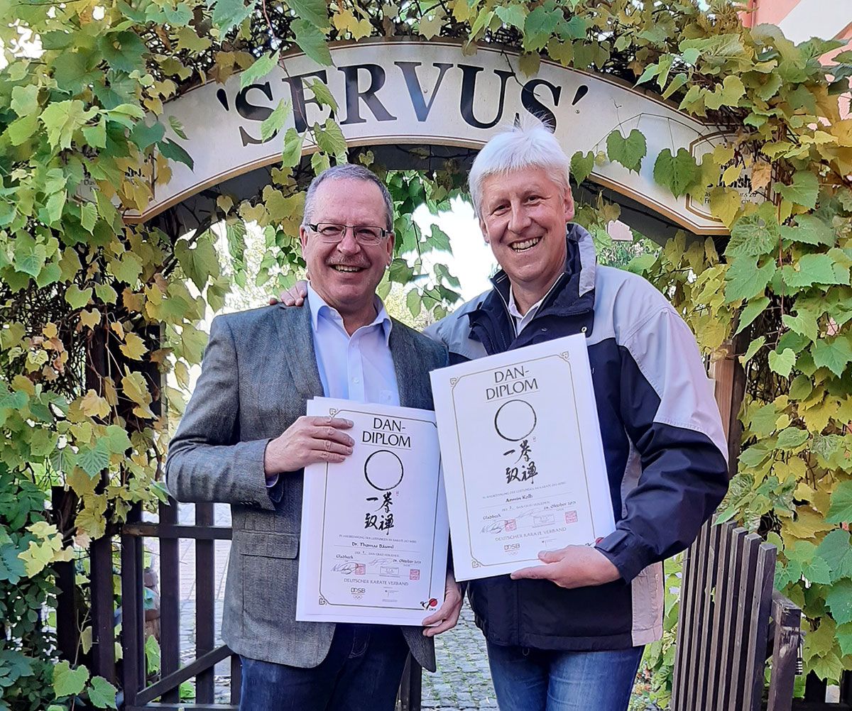 Aufgrund ihrer Expertise im medizinisch-anatomisch-physiologischen Bereich wurden beide vom scheidenden DKV Präsidenten Wolfgang Weigert mit einer sehr hohen und nicht alltäglichen Auszeichnung des Verbandes geehrt: mit der Urkunde zum 1. DAN für Thomas Bäuml und mit der Urkunde zum 2. DAN für Armin Kolb. Damit würdigte Weigert ihre großen Verdienste für den Verband. "Thomas und Armin waren über einen langen Zeitraum die Stützen unserer medizinischen Abteilung, wir haben ihnen viel zu verdanken", sagte Weigert.